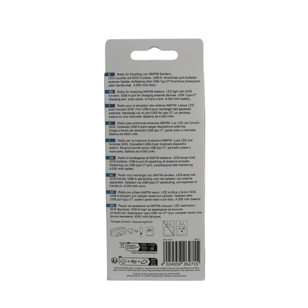| 262715 | 4024559262715 | Fontastic Solar, Dynamo AM/FM Kurbelradio, rot/sw Notfall SOS-Alarm, Outdoor Notstromquelle, T-Lampe | EU-Konformitätserklärung |