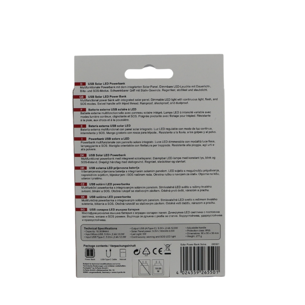 | 262173 | 4024559262173 | Solar Power Bank Xora20Q mit Wireless Charger sw 20000 mAh, FC, LED Licht, 2 x USB-A, 1 x Typ-C | EU-Konformitätserklärung |