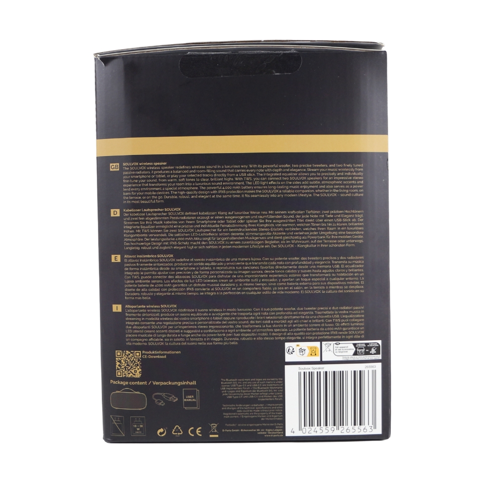 | 262258 | 4024559262258 | Drahtloser Lautsprecher "Paso" 360° LED-Lichtshow TWS, Karten Slot, Typ-C, beste Audio-Performance | EU-Konformitätserklärung |